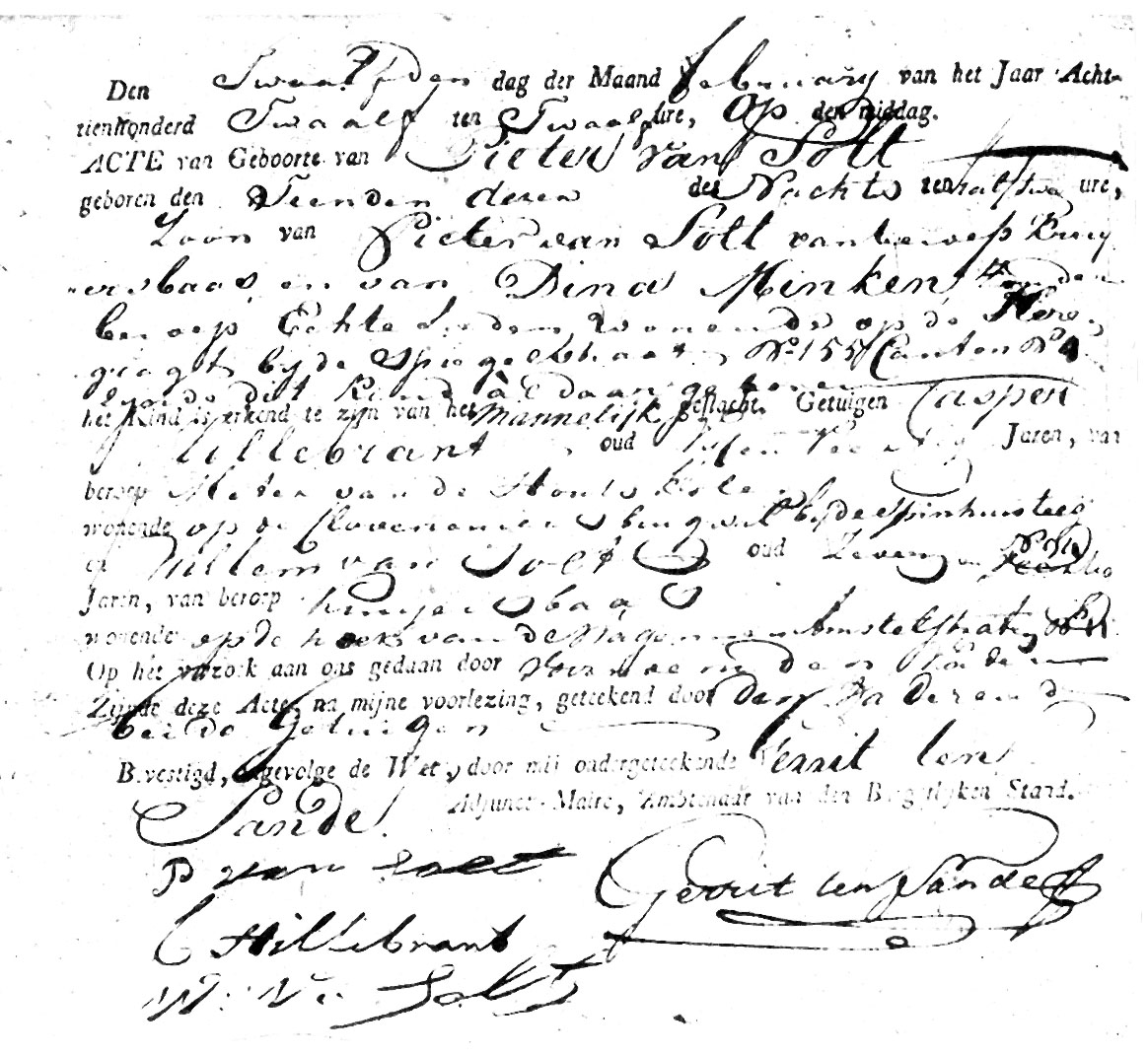 is geboren op 10 februari 1812 om 01:30 in Amsterdam [Register 2 folio 110v, Akte 1512], zoon van Pieter van Solt en Diena Minken. Van de geboorte is aangifte gedaan op 12 februari 1812. Uit de geboorteakte blijkt dat zijn vader, Pieter van Solt, van beroep kruiersbaas was en op de Herengragt bij de Spiegelstraat Nº155, Canton Nº4 woonde. Als Getuigen traden op: [1] Casper Hillebrand, 45 jaar, van beroep Meten van de Houtskolen, wonende op de Cloveniersburgwal bij de Spinhuissteeg, en [2] Willem van Solt, 47 jaar, van beroep Kruiersbaas, wonende op de hoek van de Wagen- en Amstelstraat Nº11.Huwelijk en kinderen